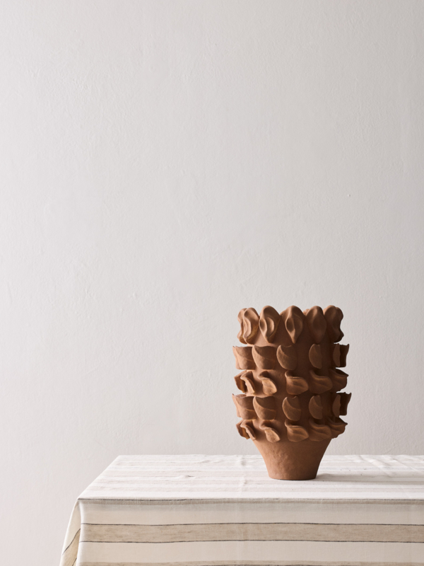 De Terra vaas is gemaakt van porseleinklei en getuigt van echt vakmanschap. De vaas wordt eerst in een mal gegoten, waarna alle details met de hand worden aangebracht, waardoor elk stuk uniek is. Hij is afgewerkt met een matte glazuur, eveneens met de hand aangebracht. De binnenzijde is behandeld om water vast te houden, maar omdat de klei van nature poreus is, kan er wat vocht doorheen sijpelen. Plaats de vaas daarom niet op delicate oppervlakken.