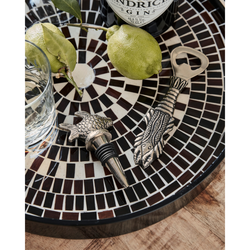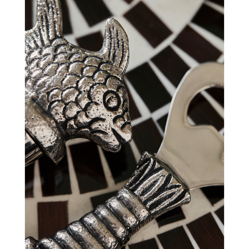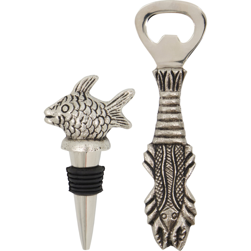 Voeg een vleugje speelsheid en verfijning toe aan je keuken met deze decoratieve baraccessoireset. De set heeft een antiekzilveren afwerking en bevat een flessenstop met een visvormige bovenkant en een flesopener met een kreeftenhandvat. Deze praktische en onmisbare set is perfect om cadeau te doen en brengt vrolijkheid in je interieur.