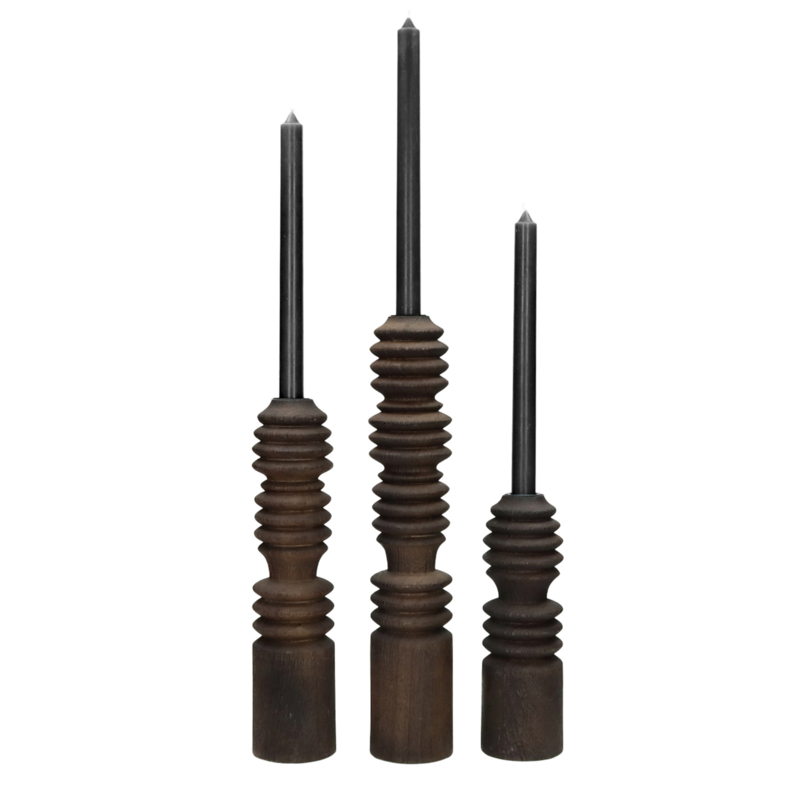 De natuurlijke houtkleur wordt prachtig versterkt door de concentrische gestreepte lijnen die in het mangohout zijn uitgesneden. Dankzij de speciale behandeling zijn de kaarsenhouders makkelijk schoon te maken en laten ze geen vlekken achter, zelfs niet bij druppelend kaarsvet.